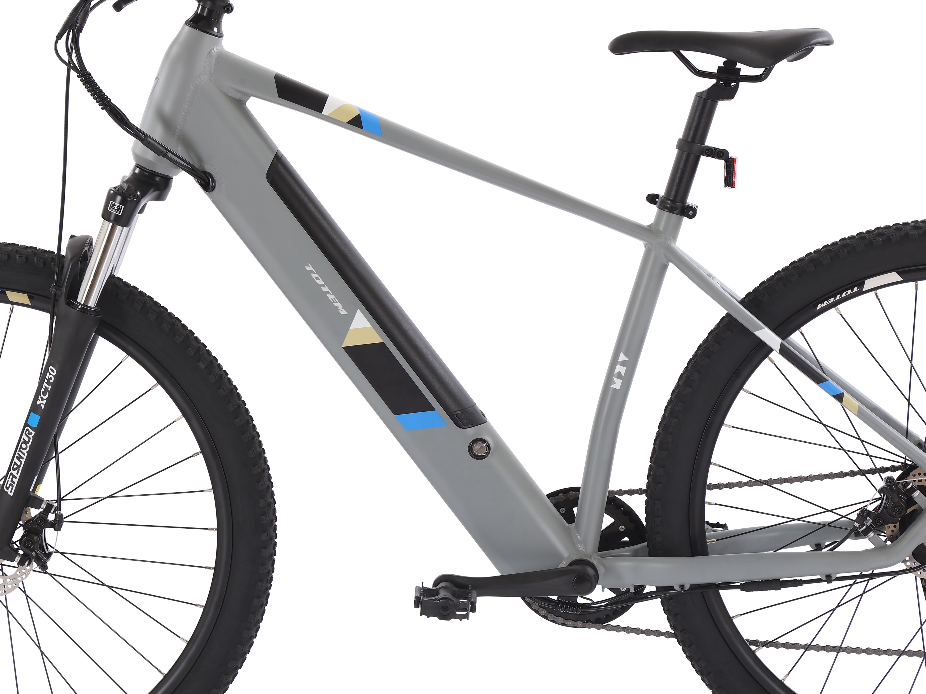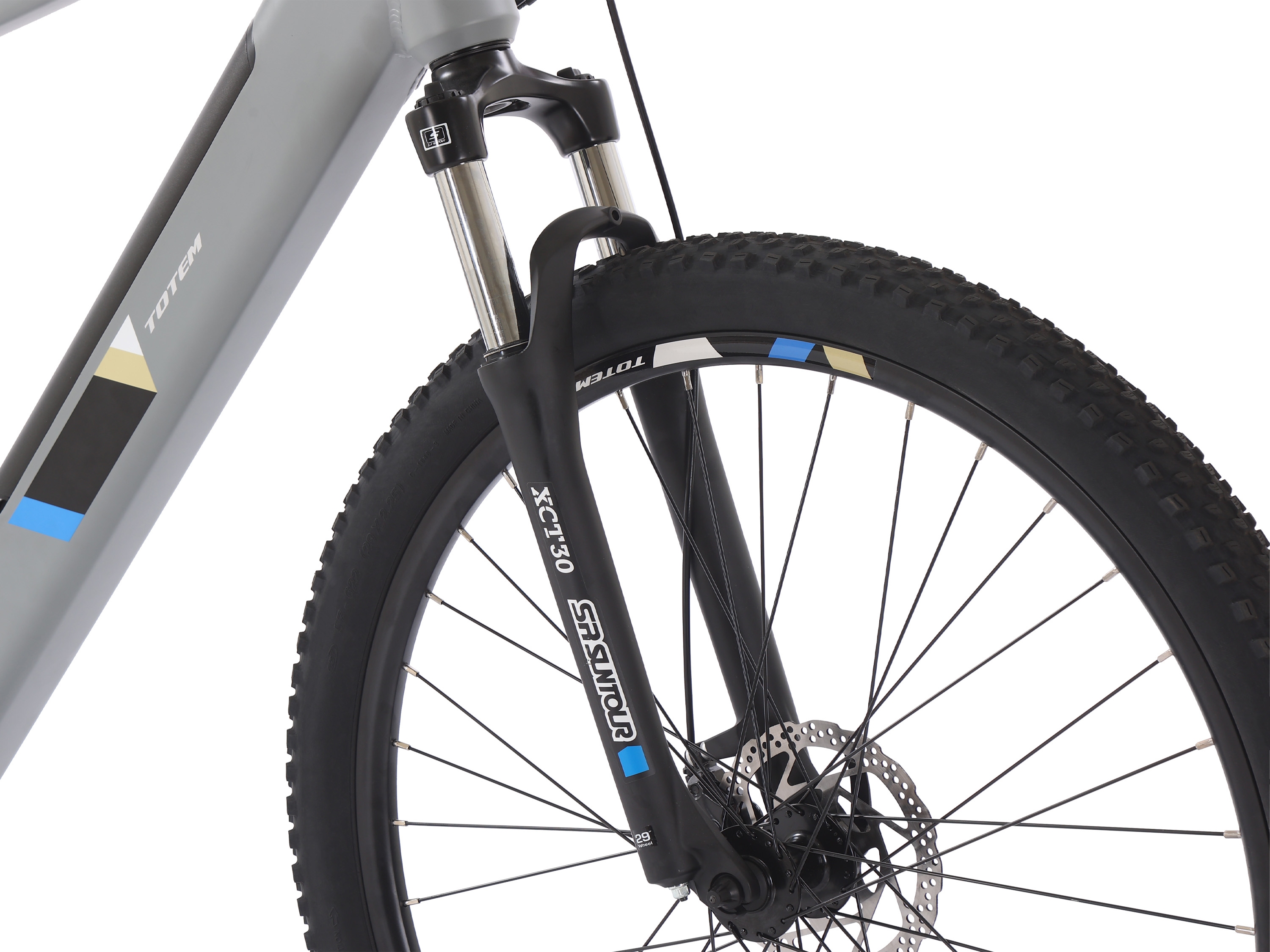 Dieses E-Bike mit gefederter Vordergabel bietet sowohl auf der Strasse als auch bei Offroad-Touren grossen Fahrspass. Dank der Shimano-Schaltung mit sieben Gängen und den mechanischen Scheibenbremsen kommst du in jedem Gelände komfortabel und sicher voran. Das benutzerfreundliche Display ermöglicht es, die Leistung des Elektromotors einfach zu steuern und die relevanten Daten im Blick zu halten. Mit einer Rahmengrösse von 48 cm ist dieses Velo besonders für grössere Personen geeignet. Geniesse die Freizeit beim Biken auf dem E-Mountainbike ORRA von TOTEM!