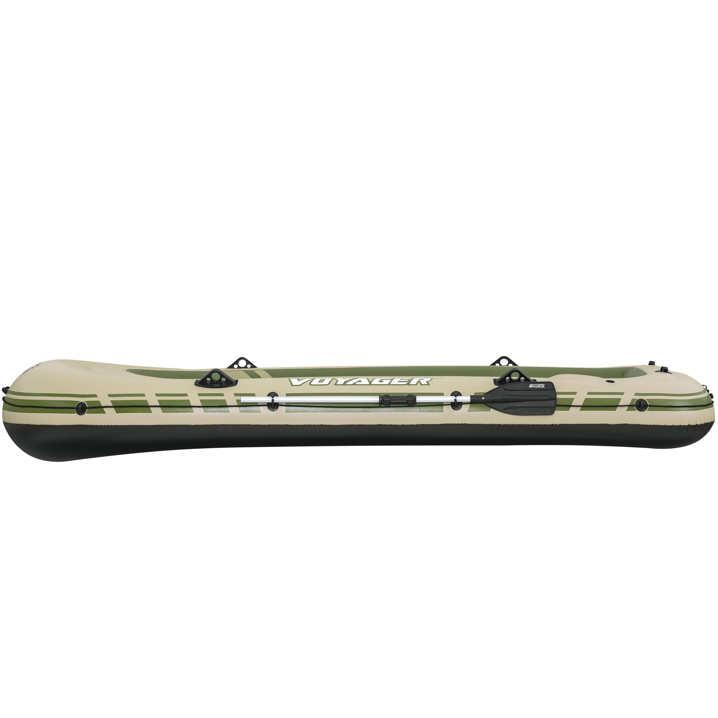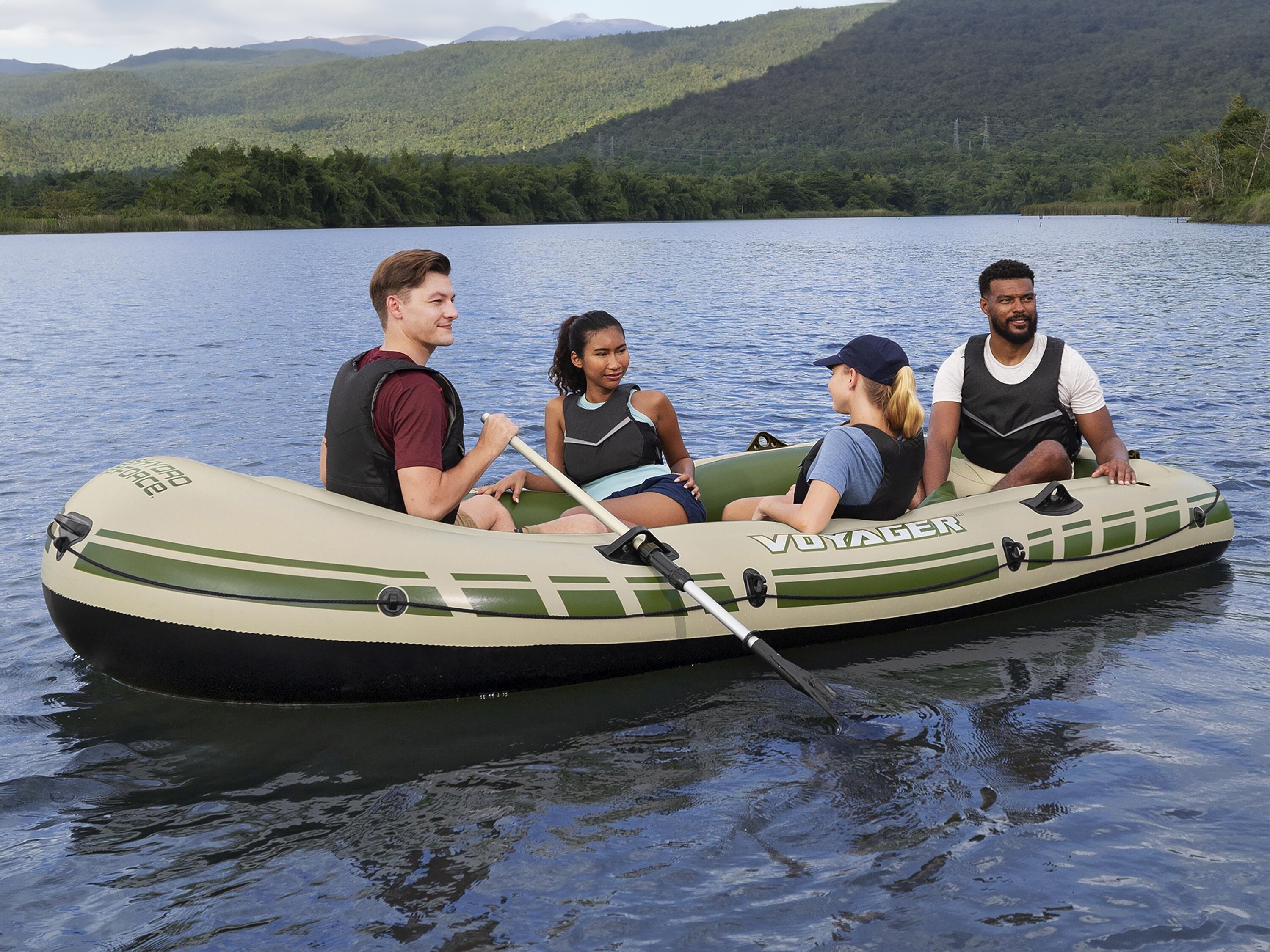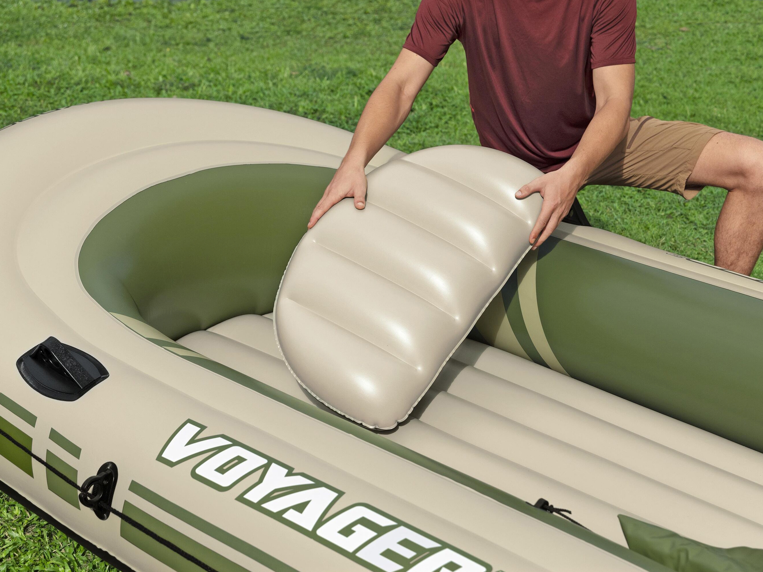 This comfortable inflatable boat offers space for four people and has inflatable seat cushions and an inflatable floor. With the hand pump, the boat is ready for use in no time. The complete set also includes oars so that the adventure on the water can start right away. The integrated oar bearings make paddling and steering particularly easy. Hobby anglers can put the fishing rod in one of the two holders and wait until something bites. Enjoy unforgettable trips with friends and family in this Voyager inflatable boat from Bestway!