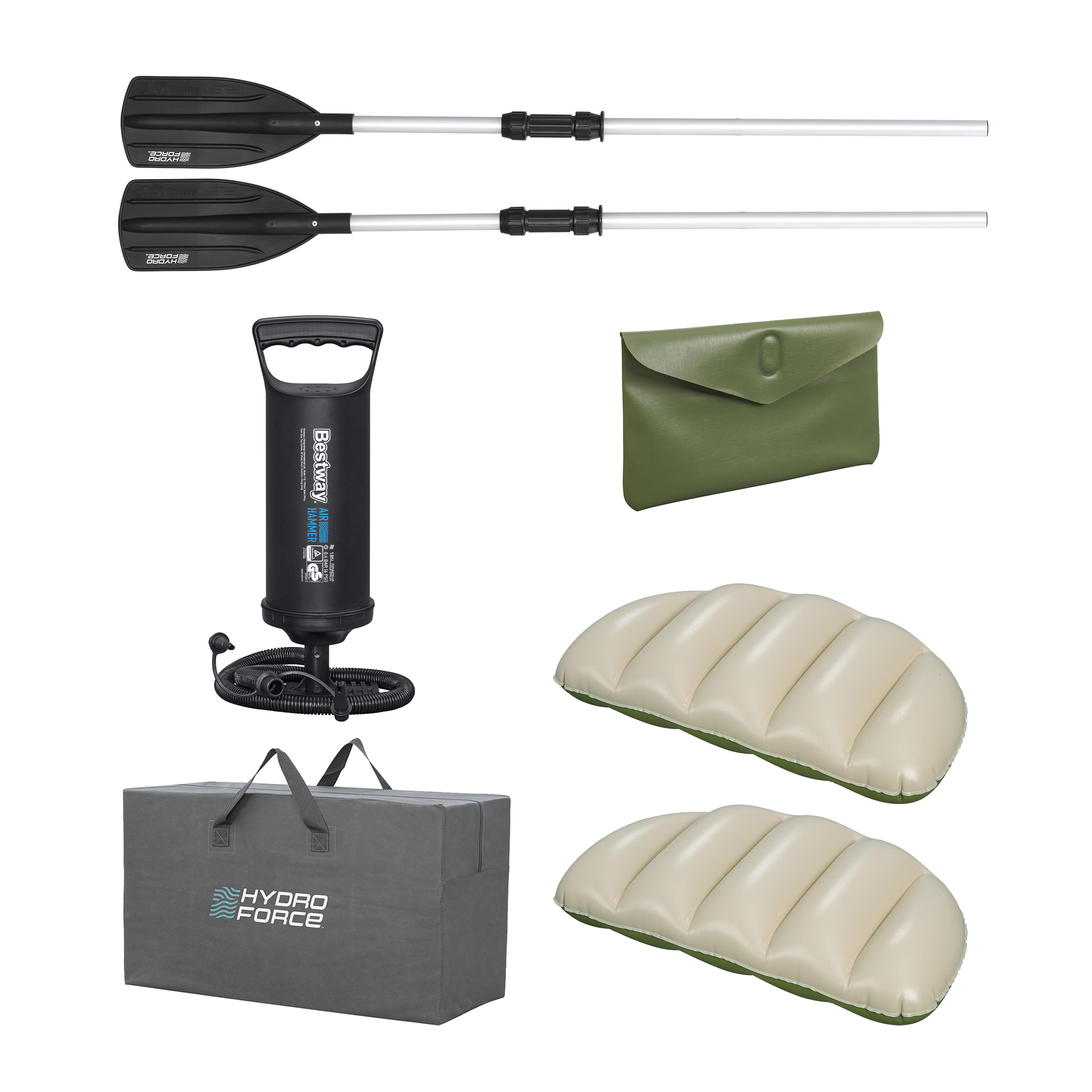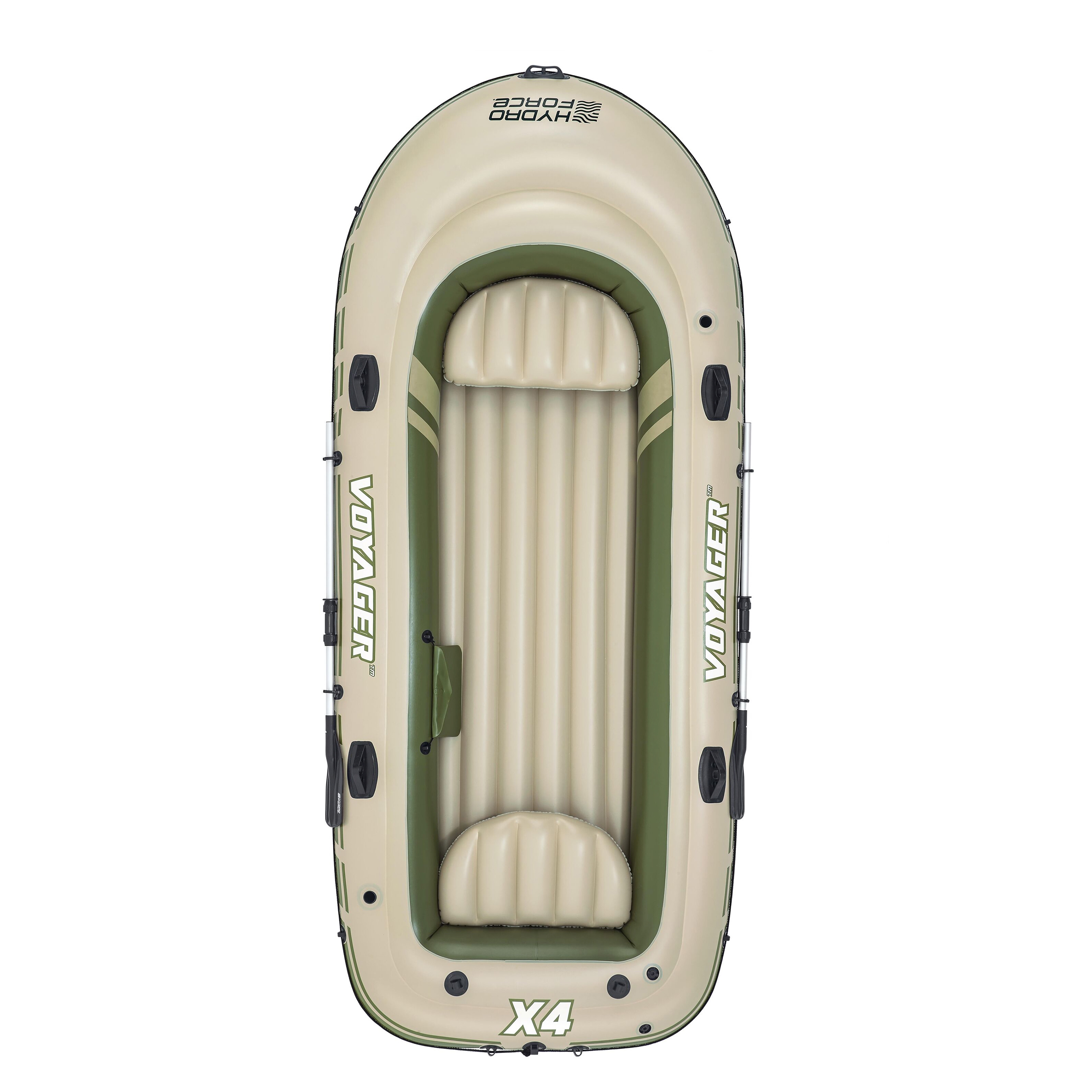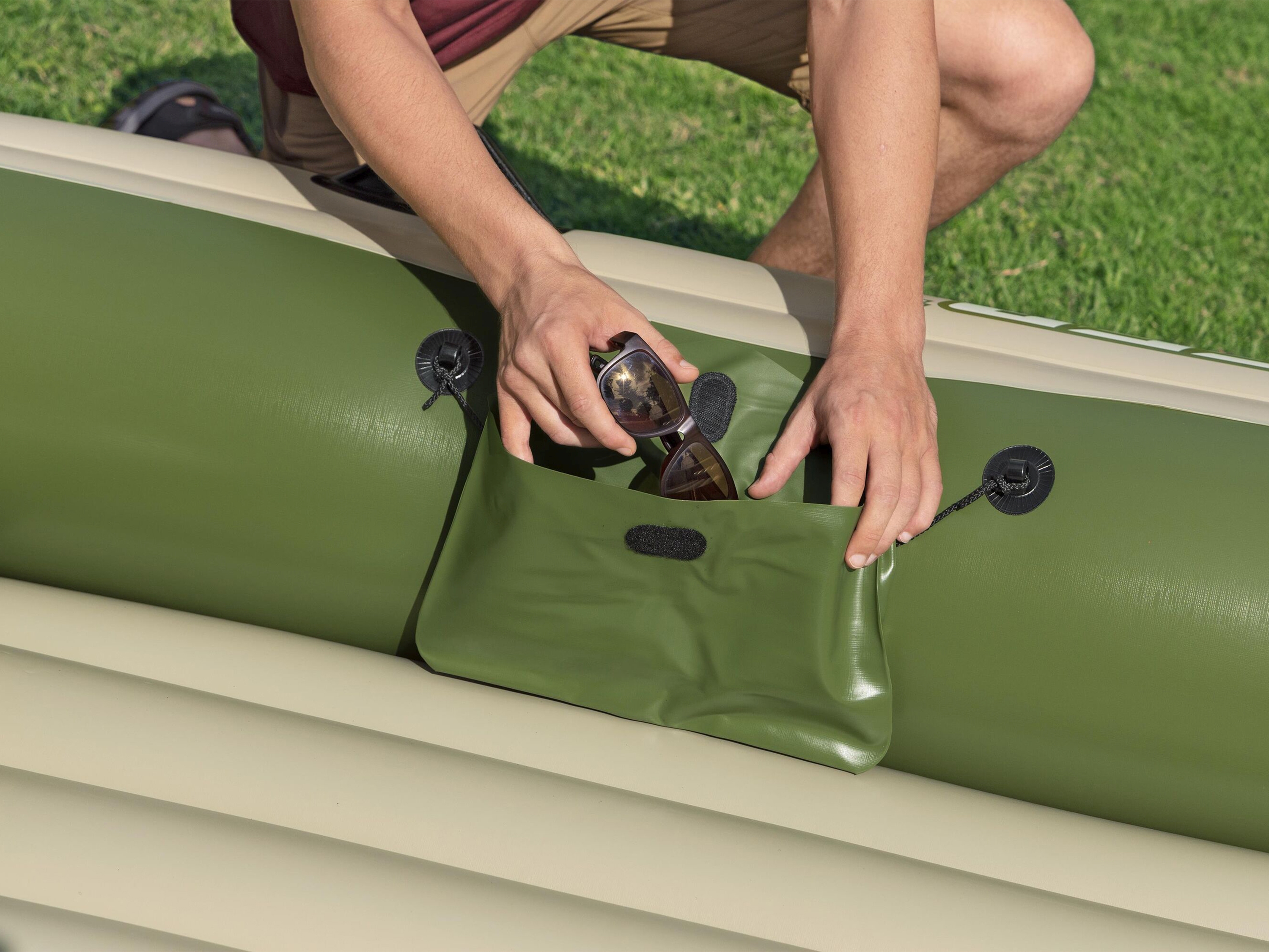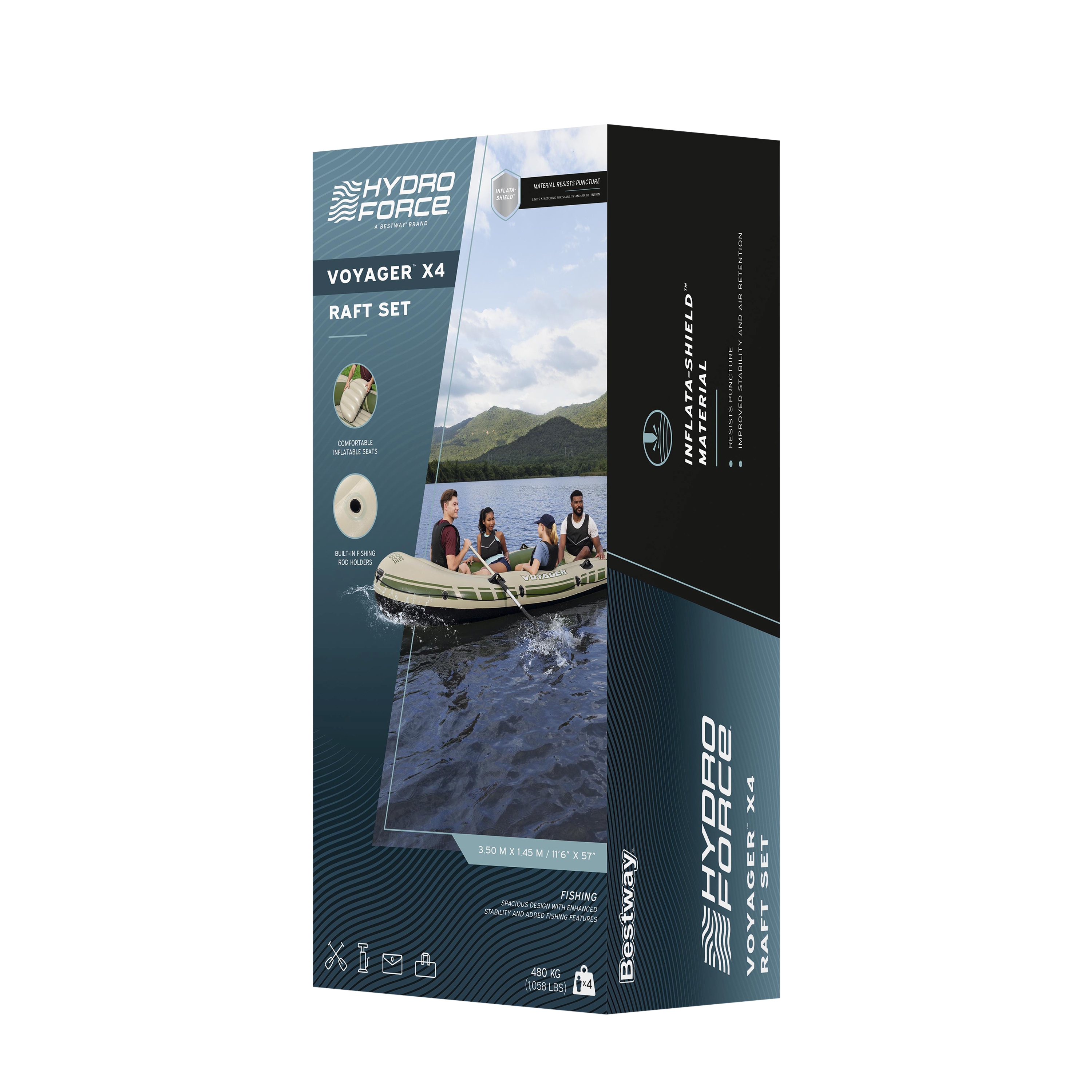 This comfortable inflatable boat offers space for four people and has inflatable seat cushions and an inflatable floor. With the hand pump, the boat is ready for use in no time. The complete set also includes oars so that the adventure on the water can start right away. The integrated oar bearings make paddling and steering particularly easy. Hobby anglers can put the fishing rod in one of the two holders and wait until something bites. Enjoy unforgettable trips with friends and family in this Voyager inflatable boat from Bestway!