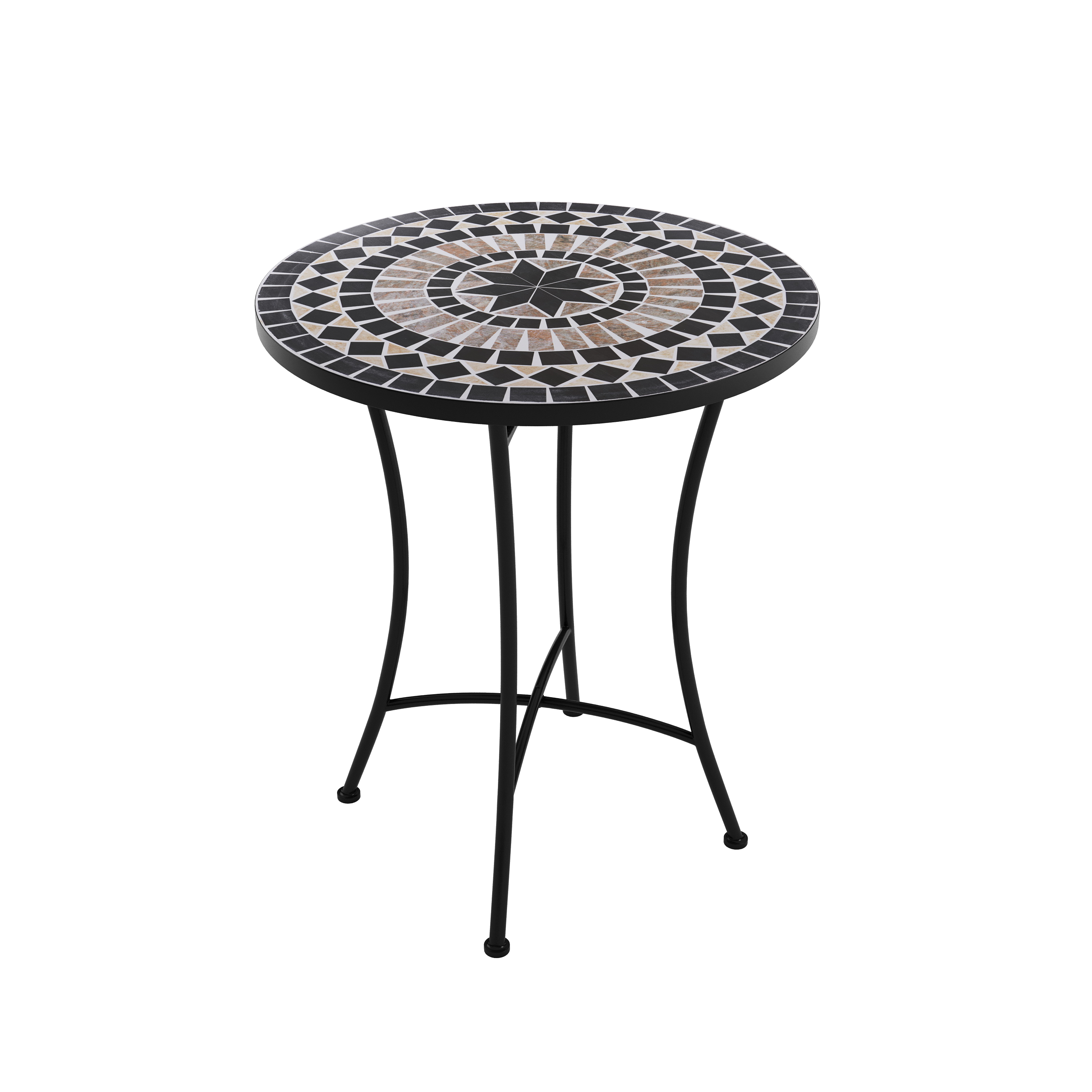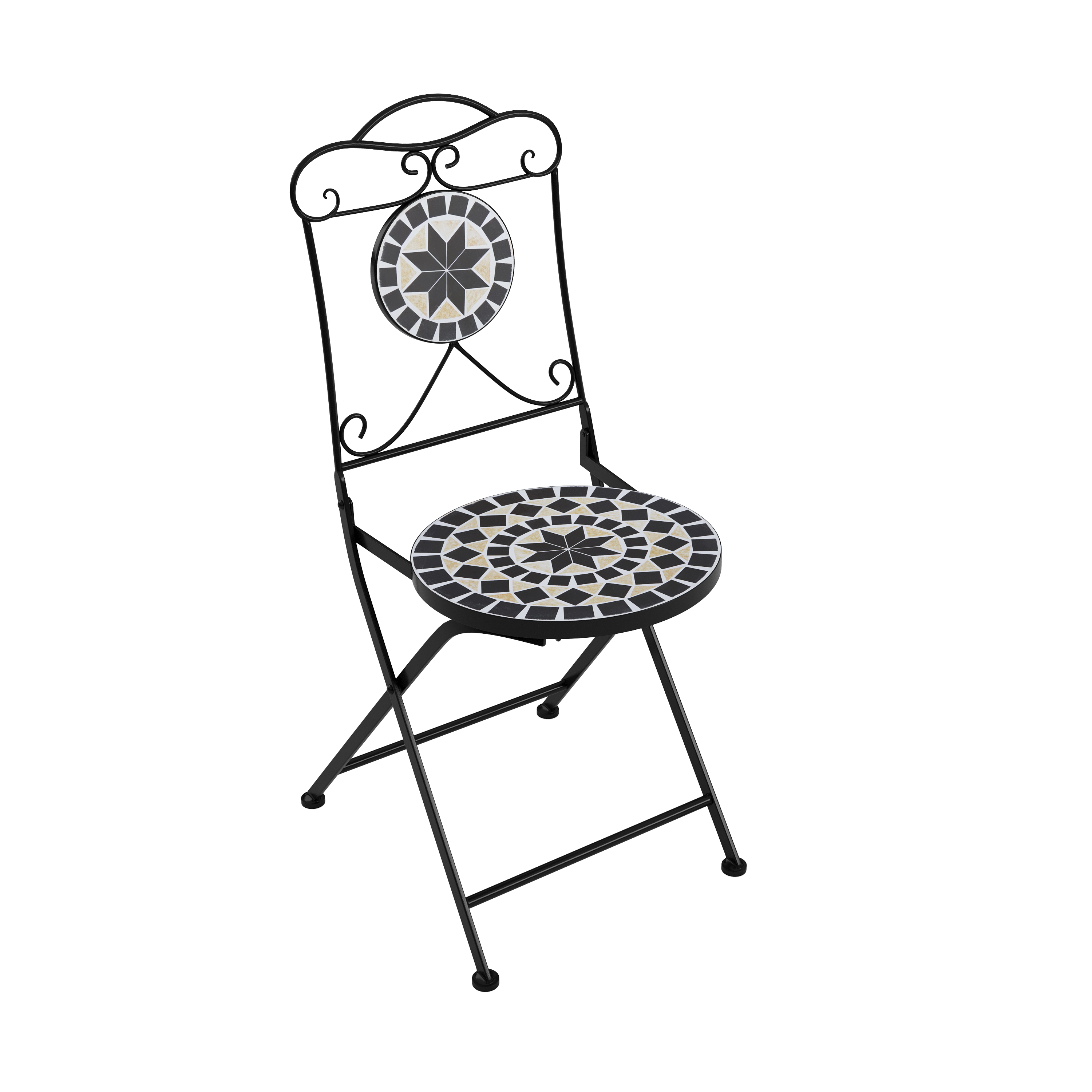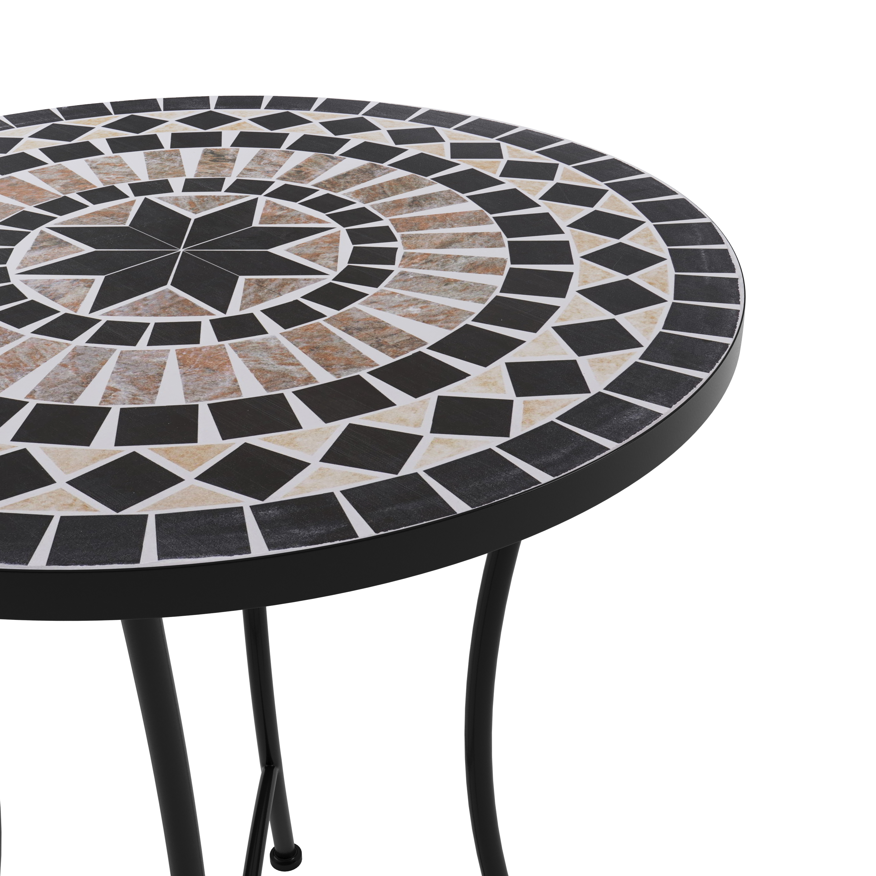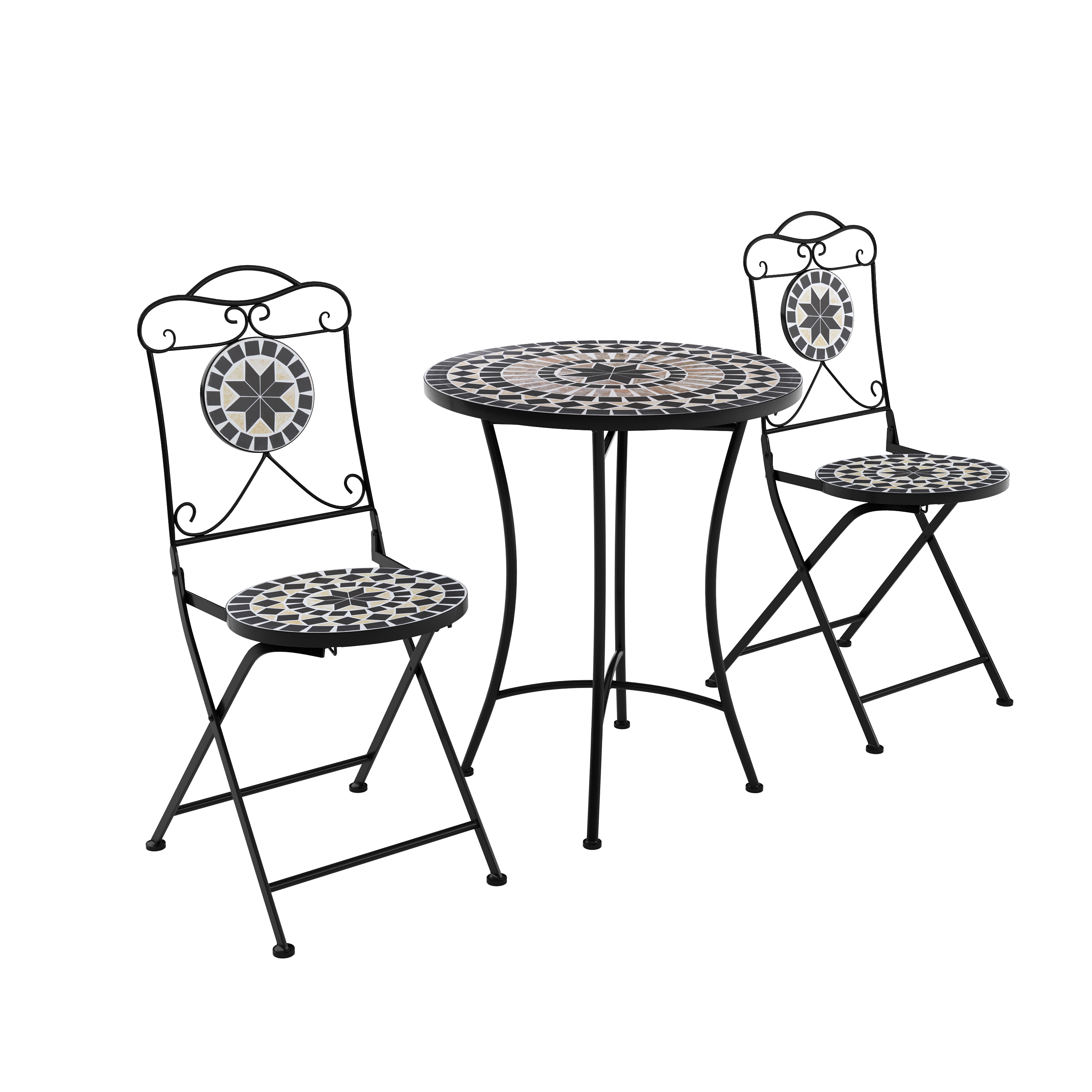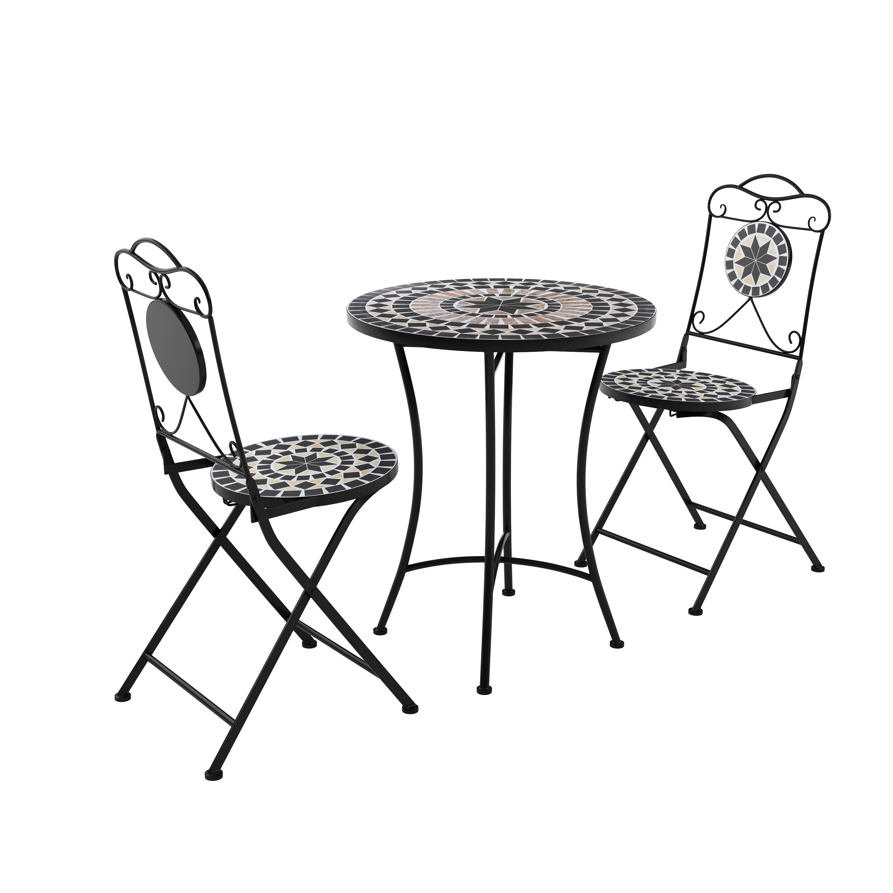 This bistro set in a pretty mosaic look will be an eye-catcher on your garden terrace or balcony. The two folding chairs and the table top are decorated with attractive patterns in black, grey and beige. Whether indoors or outdoors - with this furniture you can create a cosy seating area in a small space. The powder-coated metal frames ensure robustness and weather resistance. Enjoy a fine drink or a relaxing coffee break at this exceptional bistro table!