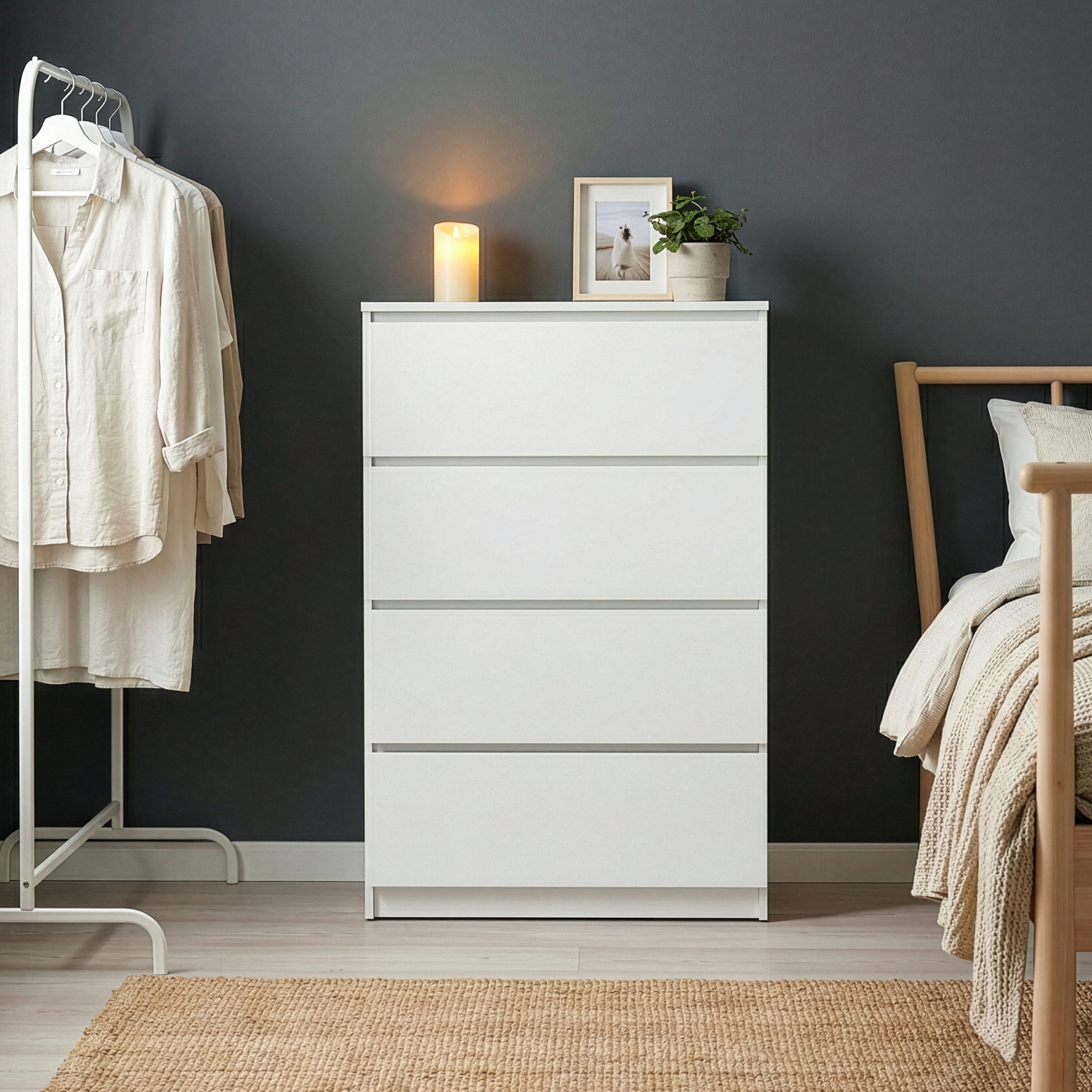 This stylish chest of drawers in elegant white has plenty of storage space in the four drawers as well as a shelf for decorations, lamps or family photos. The timeless design can be wonderfully combined with existing furnishings and fits perfectly in the living room, bedroom or entrance area. Order this beautiful chest of drawers from the TALA series now!