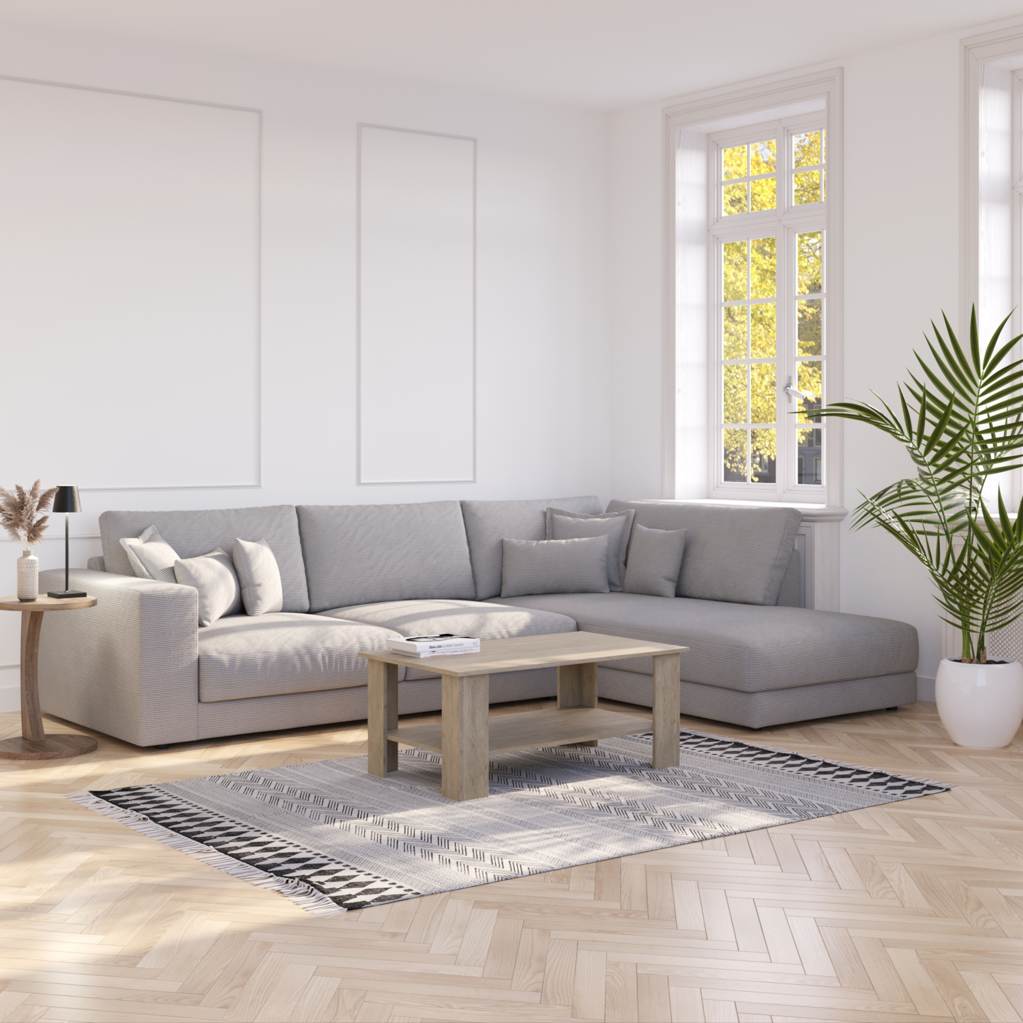 Are you one of those people who like it cosy? Then you've come to the right place with this sofa made of corduroy. The generous and softly upholstered reclining areas invite you to linger comfortably. Thanks to the matching decorative cushions, you can snuggle up and enjoy a film or a book. The couch can easily accommodate four to five people. Make your living room especially cosy with this light grey corner sofa TARJA right!