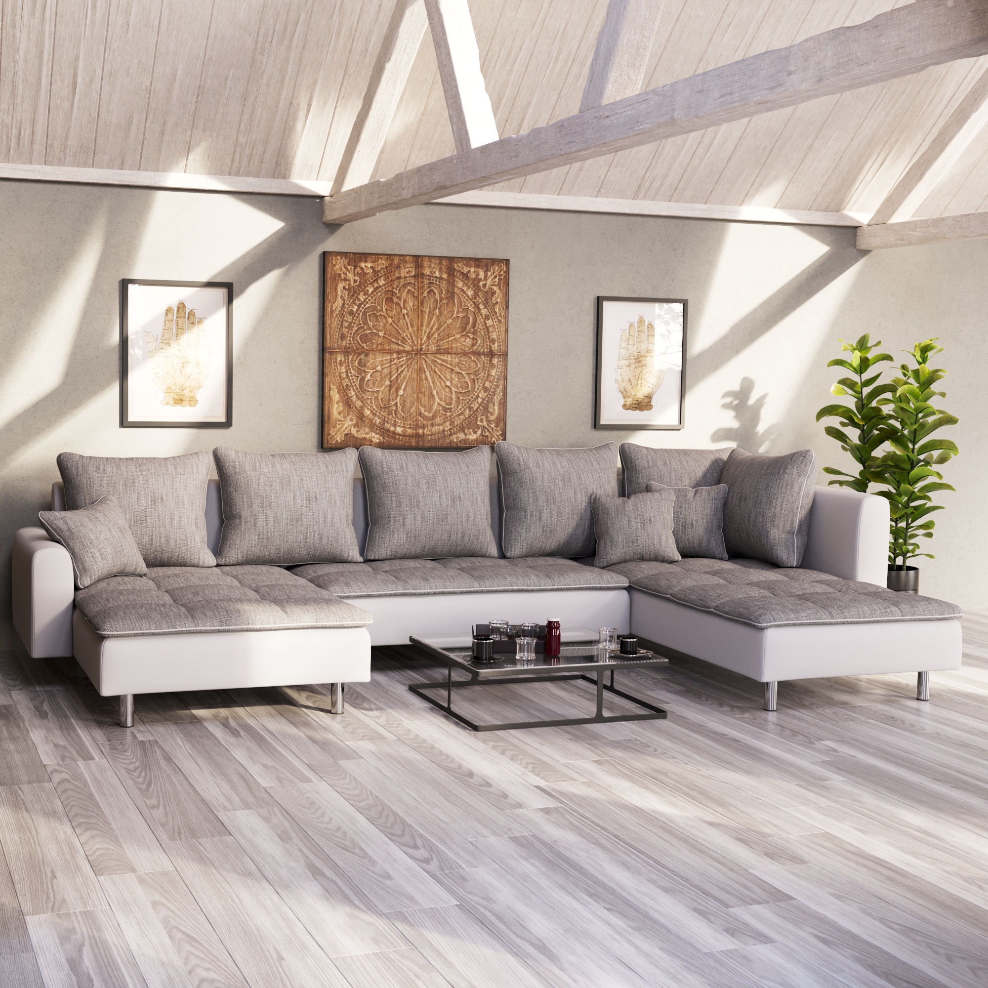 This sofa impresses with its modern and elegant design. The comfortable cushions and pillows ensure a high level of seating and reclining comfort. The special U-shape offers a reclining surface on both sides and plenty of space to relax - ideal for movie nights and social gatherings with family or friends. The white faux leather upholstery and chrome sofa legs round off the elegant look and add value to your living room . Furnish your home with the VEGAS sofa individually and stylishly!