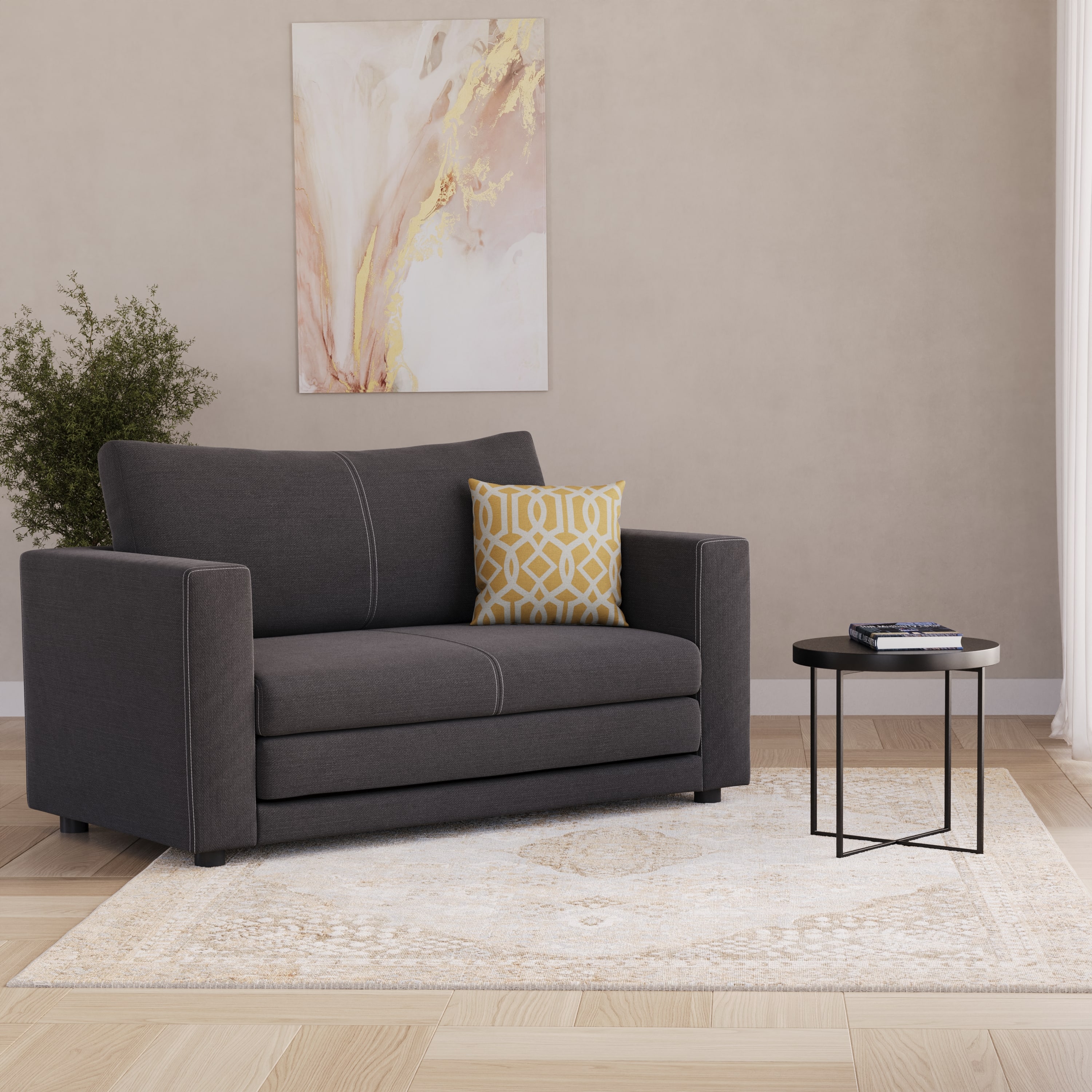Trendy and simple: this is the anthracite-coloured LIAS sofa bed with pull-out reclining surface. You can snuggle up comfortably on this small piece of living room furniture with a good book or a glass of wine and enjoy the evening after work. You and your favourite person can sit comfortably on the 2-seater. If there are suddenly surprise guests at the door or the evening in a shared flat goes on a little longer, you can simply fold out the seat and you have conjured up a ground-level bed.Furnish your living room in a particularly clever way with our minimalist sofas!