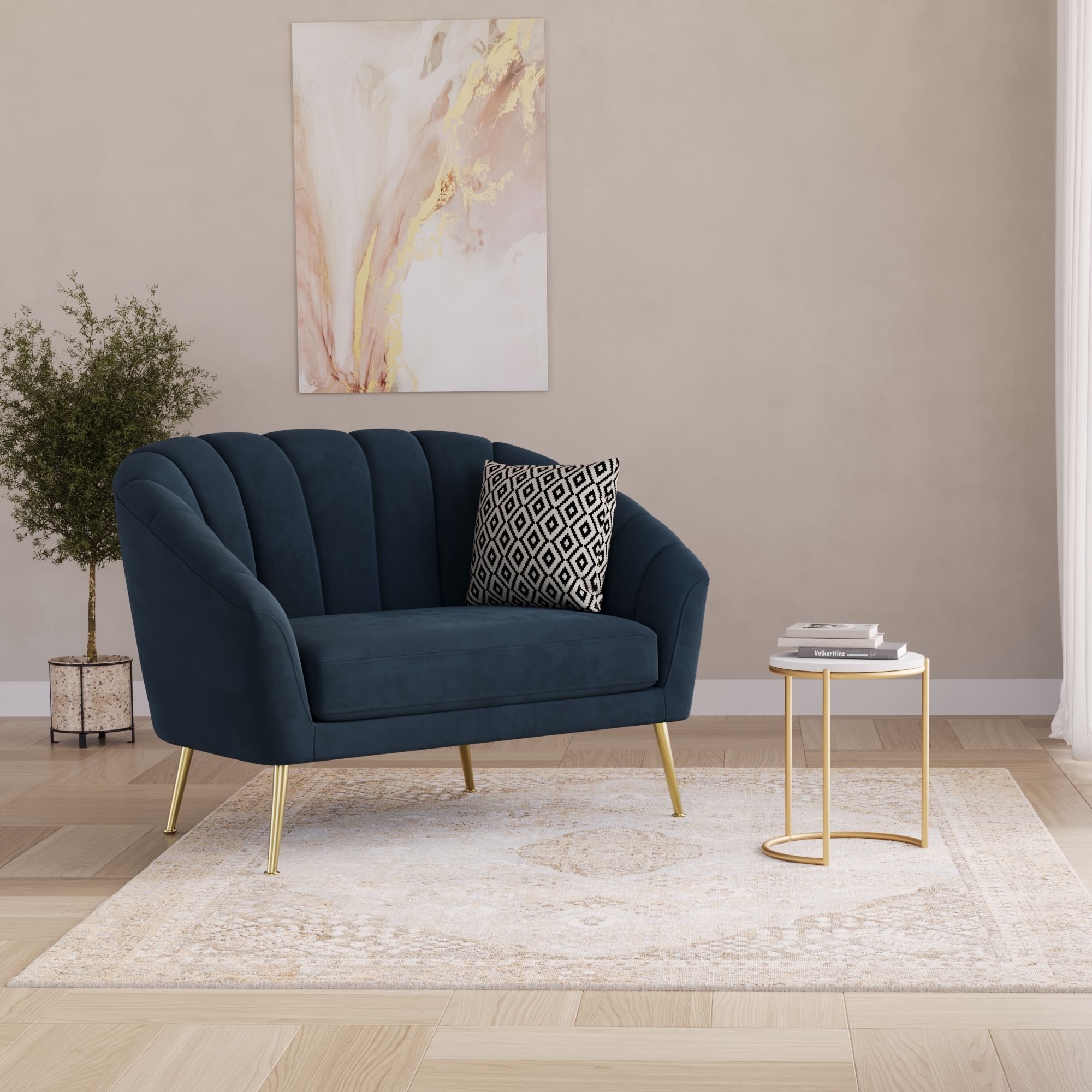 This elegant 2-seater couch refines every living room! The discreet sofa feet in golden colour go wonderfully with the strong blue of the velvet fabric and attract all eyes. The elegant design looks wonderful in your living room or in the entrance area of your company. The seat can easily be combined with a matching side table or stool. Enjoy your coffee break in style on this elegant DARIA sofa!