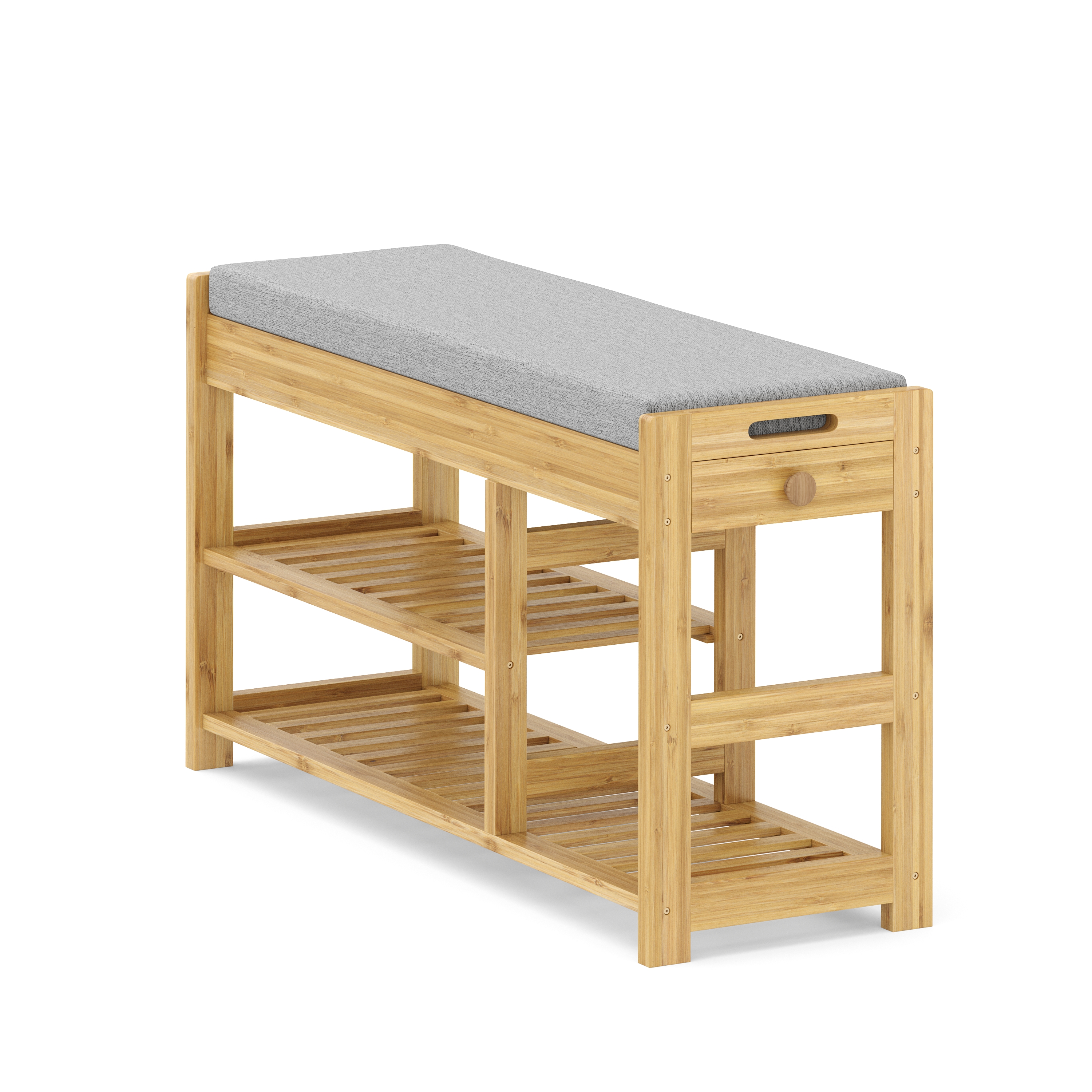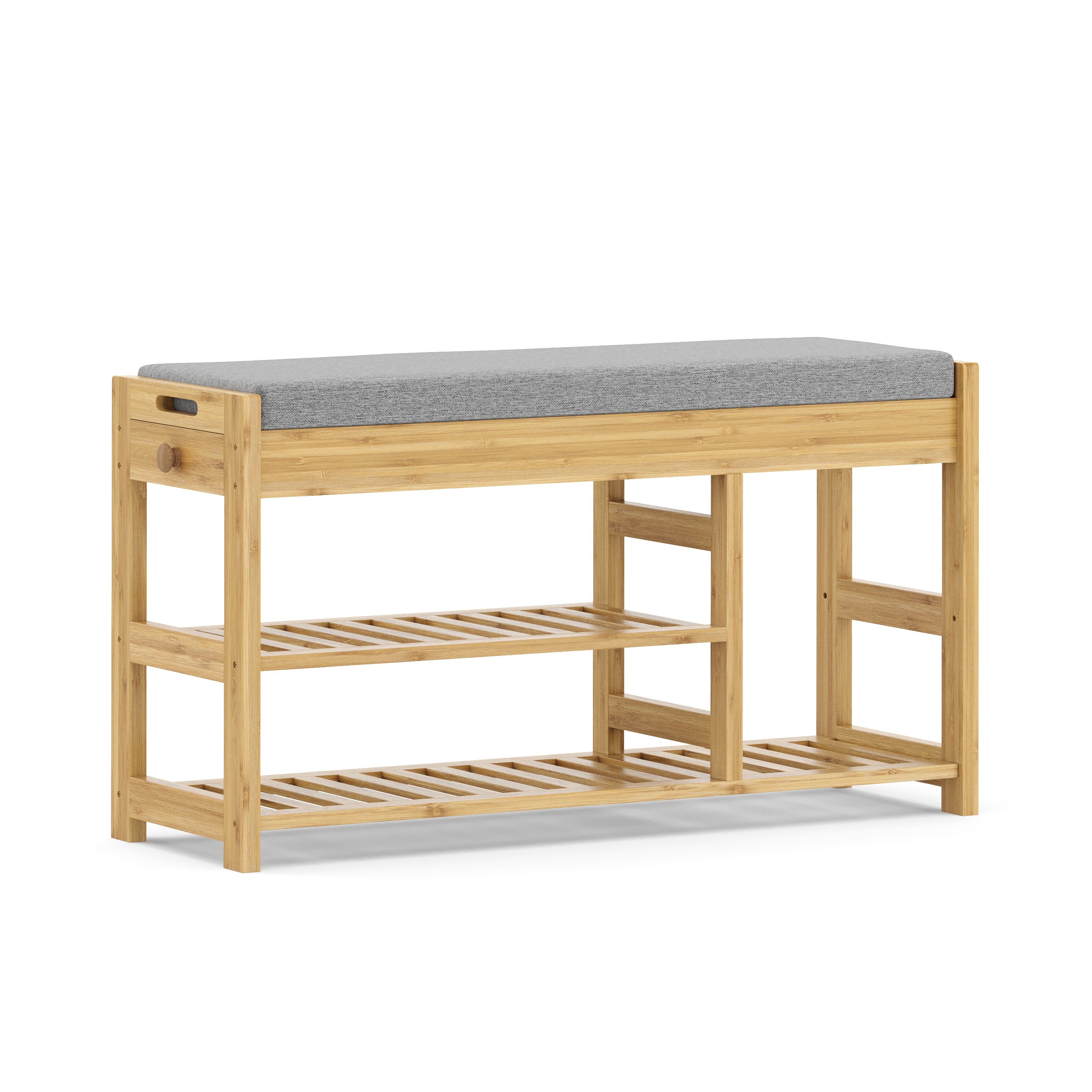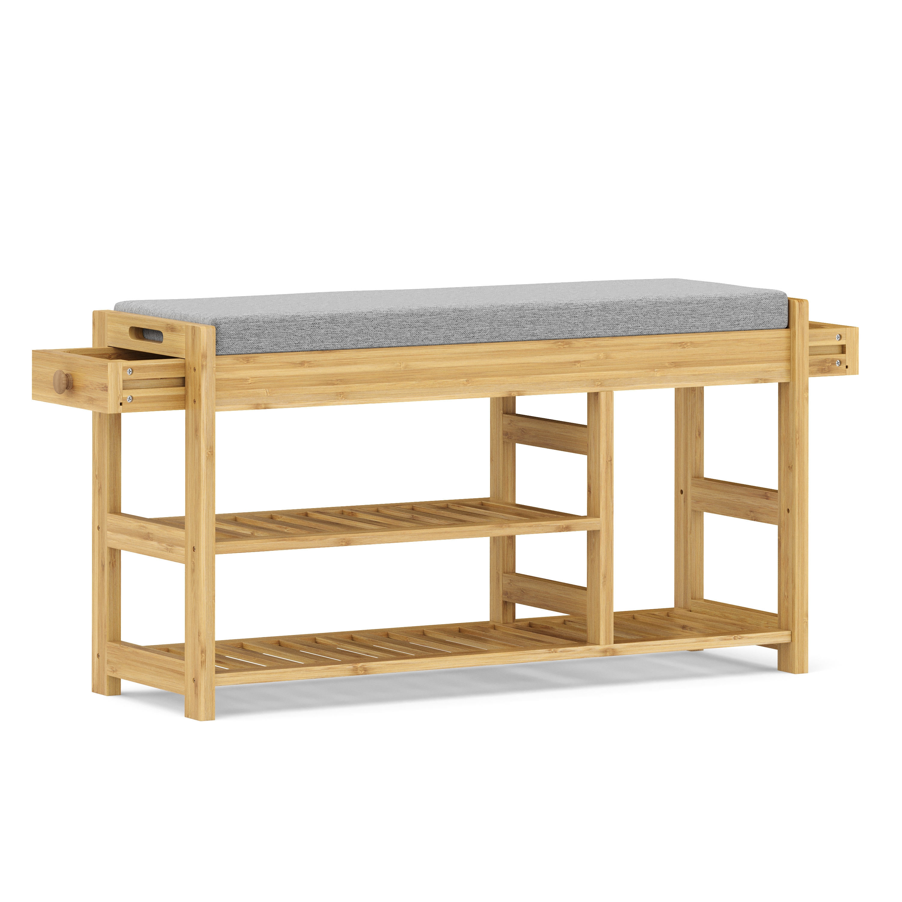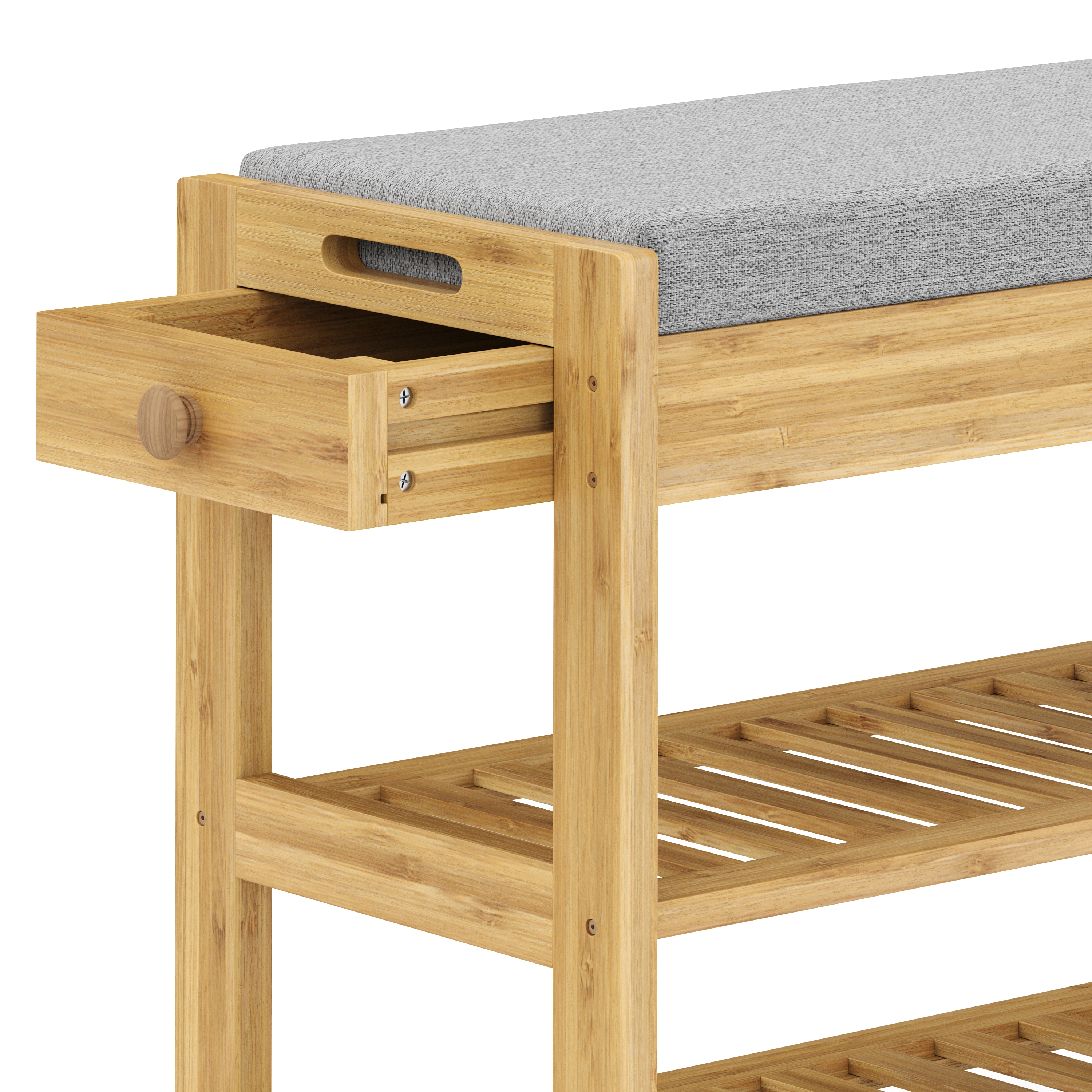 Bringe Ordnung und Komfort in deinen Eingangsbereich mit dieser praktischen Schuhbank SEREIN aus natürlichem Bambus. Die offene Bauweise sorgt für optimale Belüftung deiner Schuhe, während das weiche Sitzkissen bequemes An- und Ausziehen ermöglicht. Mit zwei Ablagen, zusätzlichem Stauraum für Stiefel sowie seitlichen Schubladen für kleine Utensilien vereint sie Funktionalität und Design. Hol dir diesen stilvollen Helfer für dein Zuhause!