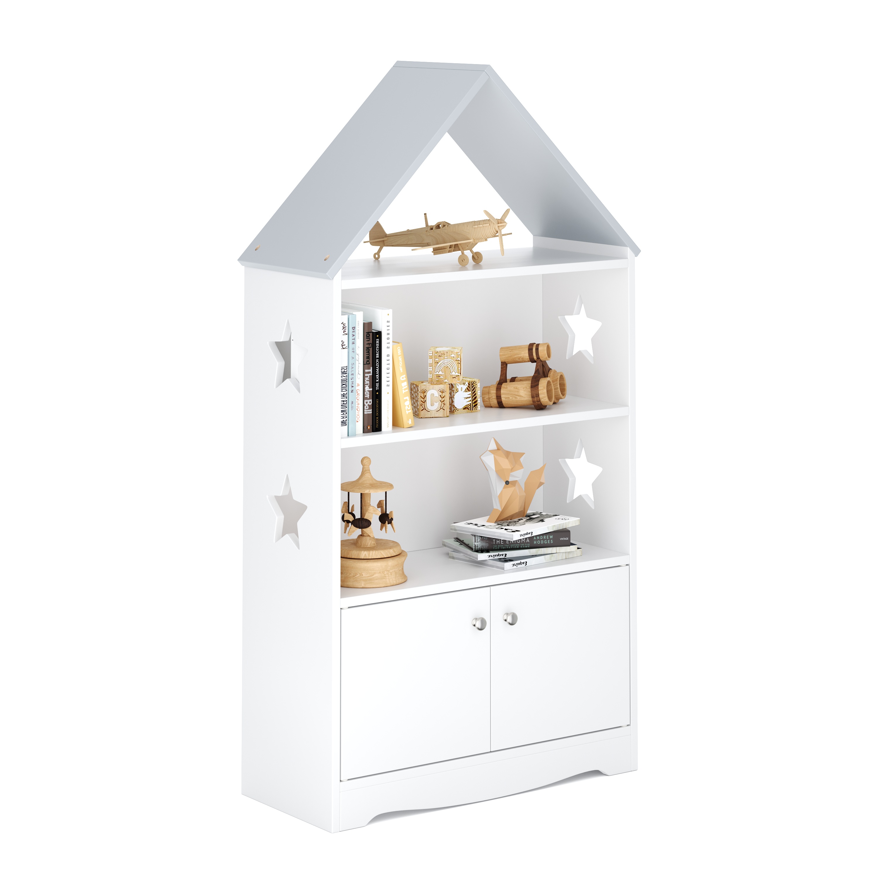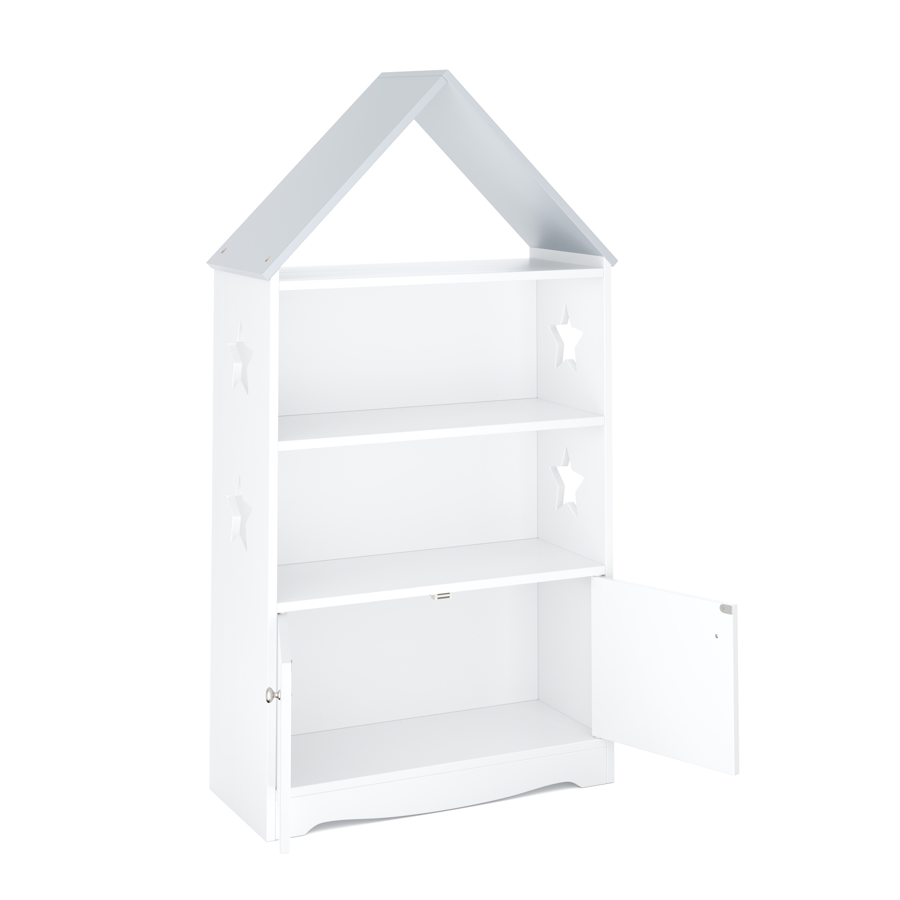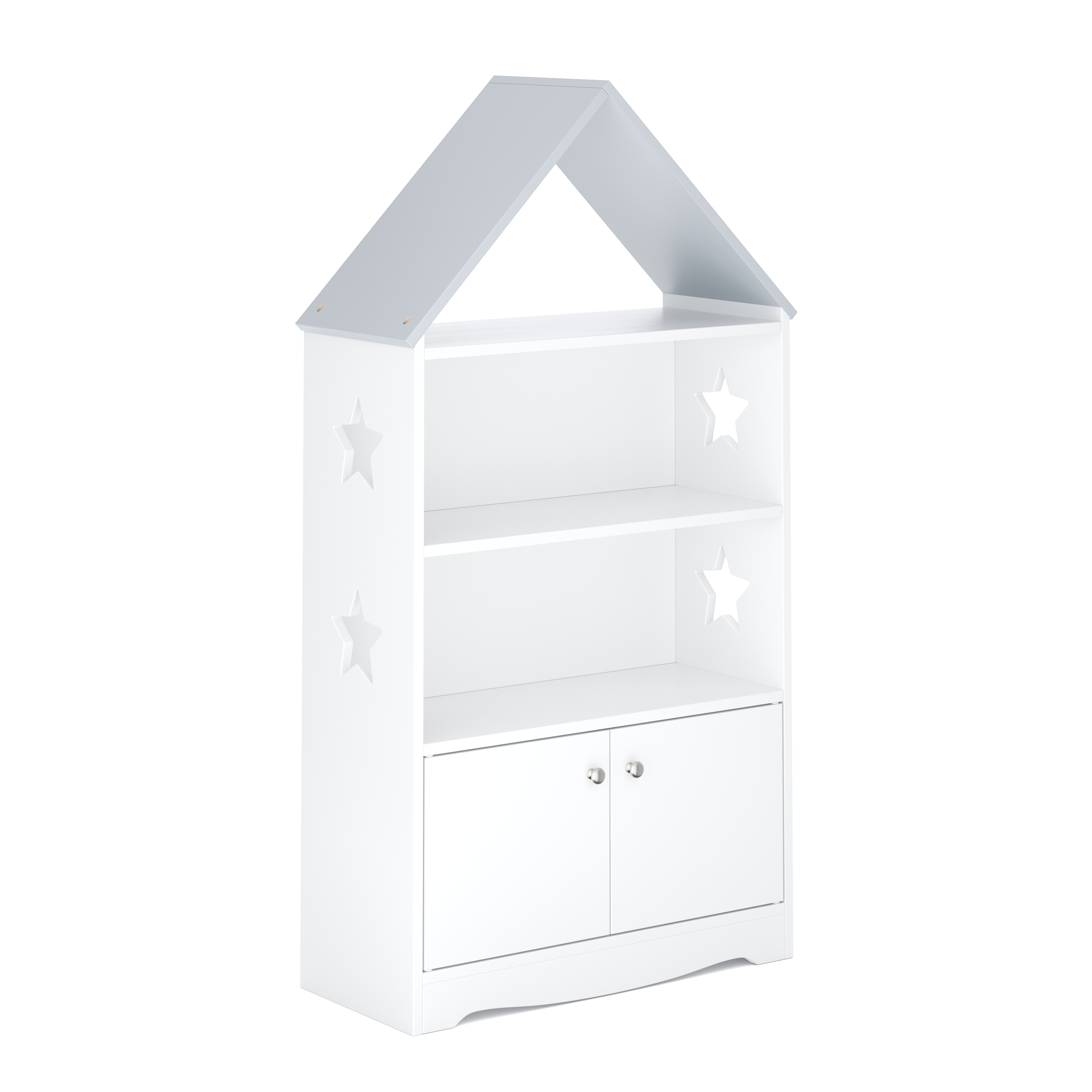 Dieses Spielzeugregal DREAMSTAR im süssen Haus-Design bringt Ordnung und Charme ins Kinderzimmer. Mit offenen Fächern für Bücher, Spiele oder Kuscheltiere und einem zusätzlichen Stauraum hinter den Doppeltüren ist alles griffbereit verstaut. Die dekorativen Sterne an den Seiten und die spielerische Dachform machen das Regal zum besonderen Hingucker. Sorge für Übersicht und schaffe gleichzeitig eine gemütliche Atmosphäre – ein praktisches Möbelstück, das Kinder lieben werden!